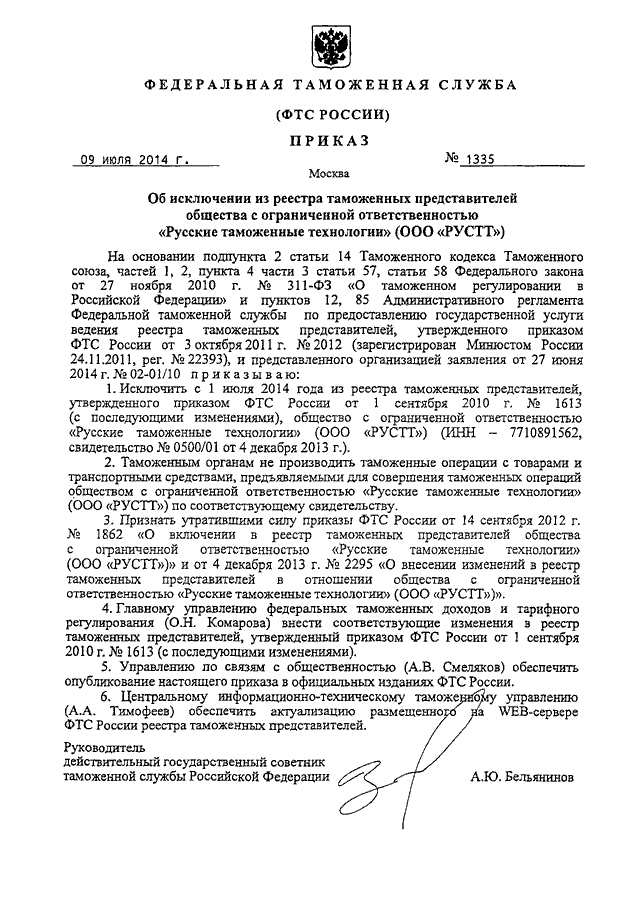 ПРИКАЗ ФТС РФ от 09.07.2014 N 1335
