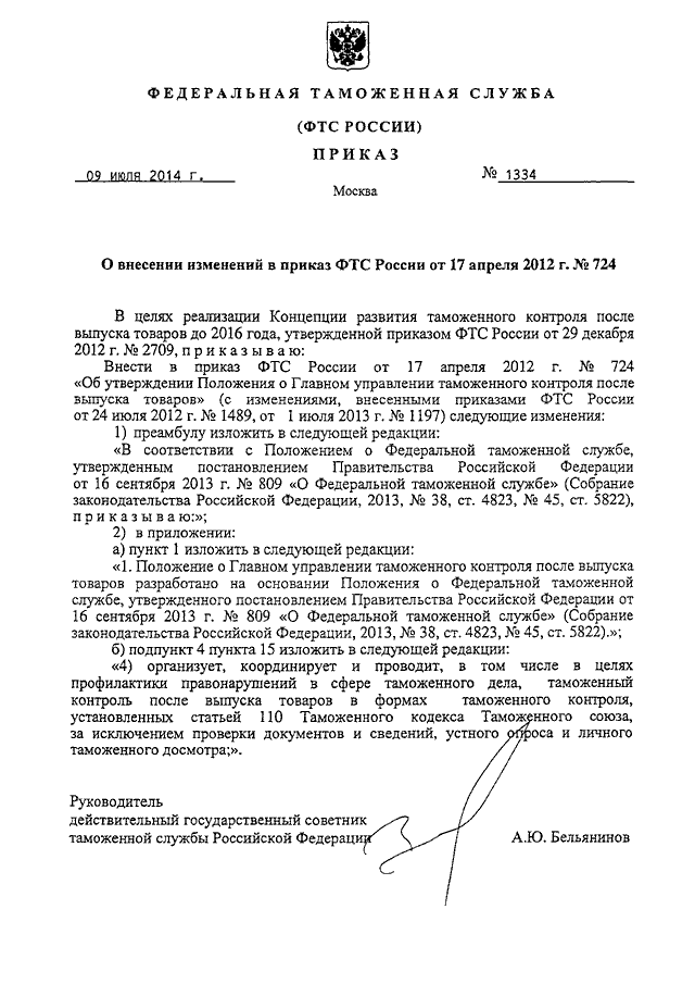 ПРИКАЗ ФТС РФ от 09.07.2014 N 1334