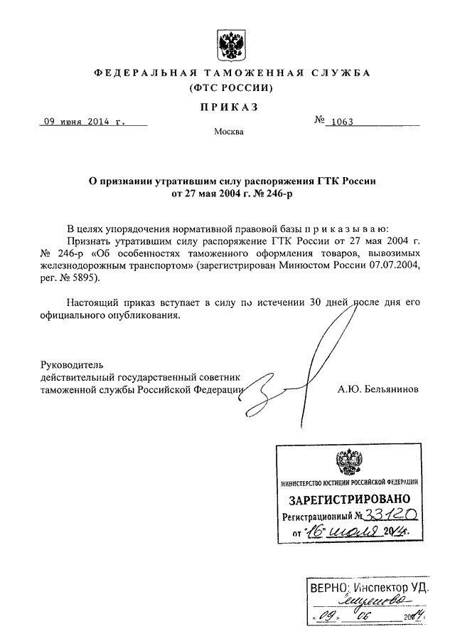ПРИКАЗ ФТС РФ от 09.06.2014 N 1063