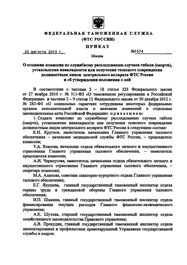 "О СОЗДАНИИ КОМИССИИ ПО СЛУЖЕБНОМУ РАССЛЕДОВАНИЮ СЛУЧАЕВ ГИБЕЛИ (СМЕРТИ), УСТАНОВЛЕНИЯ ИНВАЛИДНОСТИ ИЛИ ПОЛУЧЕНИЯ ТЕЛЕСНОГО ПОВРЕЖДЕНИЯ ДОЛЖНОСТНЫМ ЛИЦОМ ЦЕНТРАЛЬНОГО АППАРАТА ФТС РОССИИ И ОБ УТВЕРЖДЕНИИ ПОЛОЖЕНИЯ О НЕЙ"