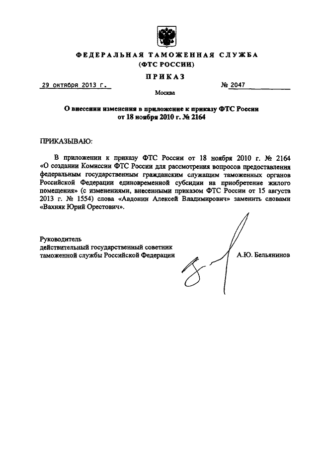 ПРИКАЗ ФТС РФ от 29.10.2013 N 2047