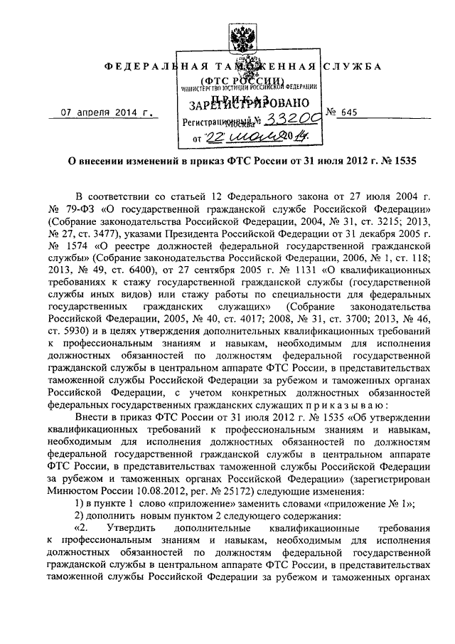 ПРИКАЗ ФТС РФ от 07.04.2014 N 645