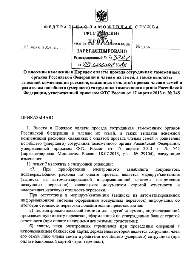 ПРИКАЗ ФТС РФ от 23.06.2014 N 1166
