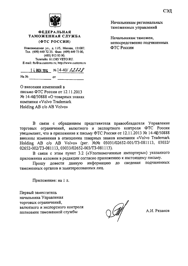 "О ВНЕСЕНИИ ИЗМЕНЕНИЙ В ПИСЬМО ФТС РОССИИ ОТ 12.11.2013 N 14-42/50888 "О ТОВАРНЫХ ЗНАКАХ КОМПАНИИ "VOLVO TRADEMARK HOLDING AB C/O AB VOLVO"