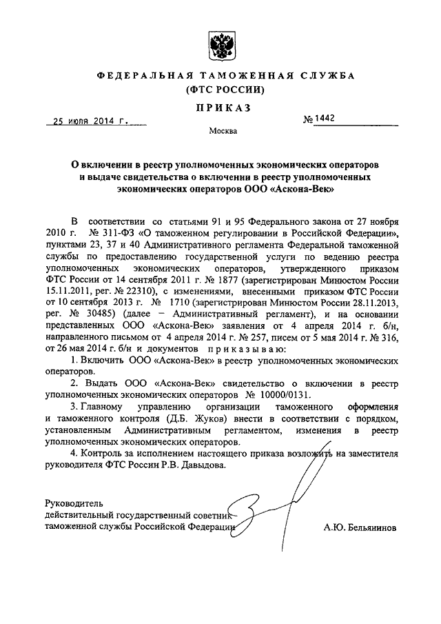 "О ВКЛЮЧЕНИИ В РЕЕСТР УПОЛНОМОЧЕННЫХ ЭКОНОМИЧЕСКИХ ОПЕРАТОРОВ И ВЫДАЧЕ СВИДЕТЕЛЬСТВА О ВКЛЮЧЕНИИ В РЕЕСТР УПОЛНОМОЧЕННЫХ ЭКОНОМИЧЕСКИХ ОПЕРАТОРОВ ООО "АСКОНА-ВЕК"
