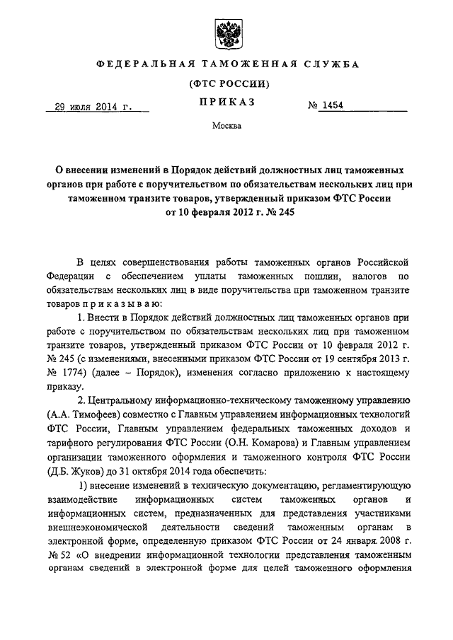 ПРИКАЗ ФТС РФ от 29.07.2014 N 1454