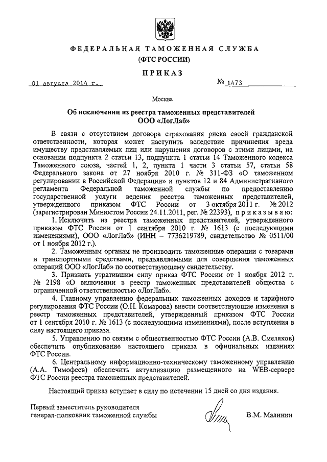ПРИКАЗ ФТС РФ от 01.08.2014 N 1473