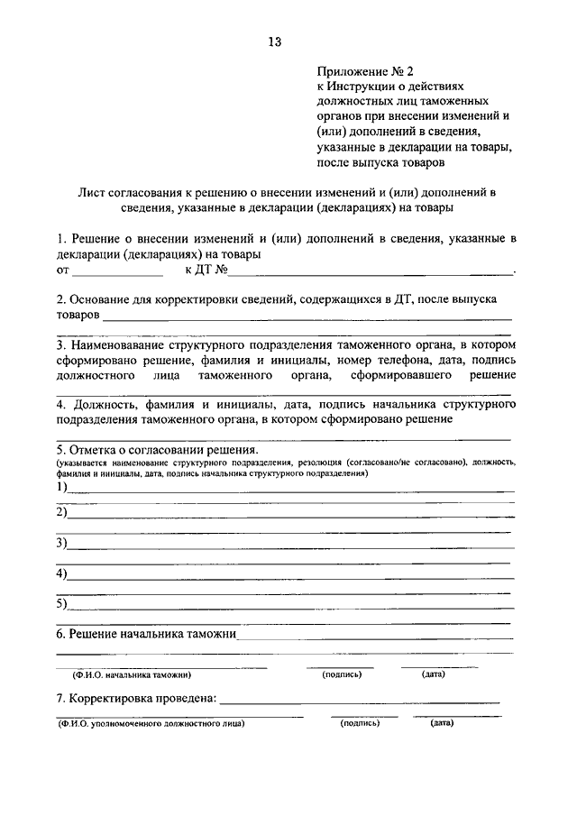 "ОБ УТВЕРЖДЕНИИ ИНСТРУКЦИИ О ДЕЙСТВИЯХ ДОЛЖНОСТНЫХ ЛИЦ ТАМОЖЕННЫХ ОРГАНОВ ПРИ ВНЕСЕНИИ ИЗМЕНЕНИЙ И (ИЛИ) ДОПОЛНЕНИЙ В СВЕДЕНИЯ, УКАЗАННЫЕ В ДЕКЛАРАЦИИ НА ТОВАРЫ, ПОСЛЕ ВЫПУСКА ТОВАРОВ"