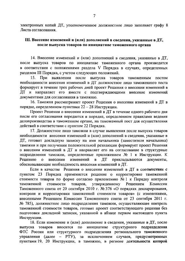 "ОБ УТВЕРЖДЕНИИ ИНСТРУКЦИИ О ДЕЙСТВИЯХ ДОЛЖНОСТНЫХ ЛИЦ ТАМОЖЕННЫХ ОРГАНОВ ПРИ ВНЕСЕНИИ ИЗМЕНЕНИЙ И (ИЛИ) ДОПОЛНЕНИЙ В СВЕДЕНИЯ, УКАЗАННЫЕ В ДЕКЛАРАЦИИ НА ТОВАРЫ, ПОСЛЕ ВЫПУСКА ТОВАРОВ"
