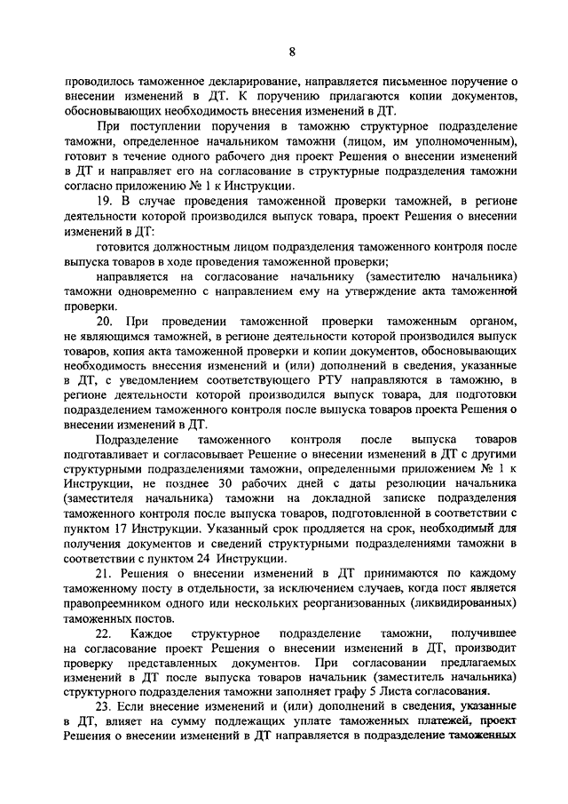 "ОБ УТВЕРЖДЕНИИ ИНСТРУКЦИИ О ДЕЙСТВИЯХ ДОЛЖНОСТНЫХ ЛИЦ ТАМОЖЕННЫХ ОРГАНОВ ПРИ ВНЕСЕНИИ ИЗМЕНЕНИЙ И (ИЛИ) ДОПОЛНЕНИЙ В СВЕДЕНИЯ, УКАЗАННЫЕ В ДЕКЛАРАЦИИ НА ТОВАРЫ, ПОСЛЕ ВЫПУСКА ТОВАРОВ"