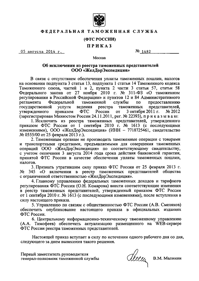 ПРИКАЗ ФТС РФ от 05.08.2014 N 1482