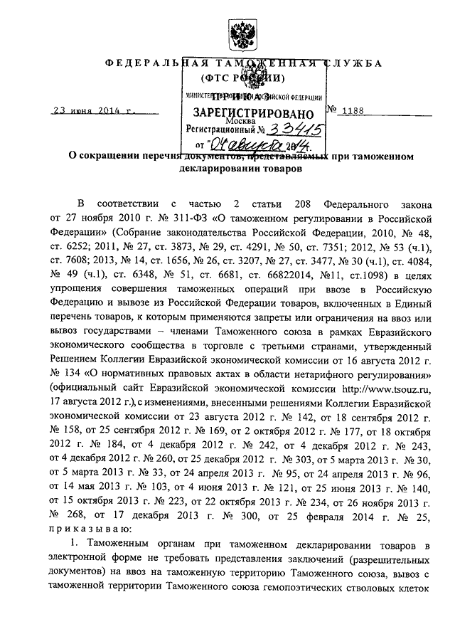 ПРИКАЗ ФТС РФ от 23.06.2014 N 1188