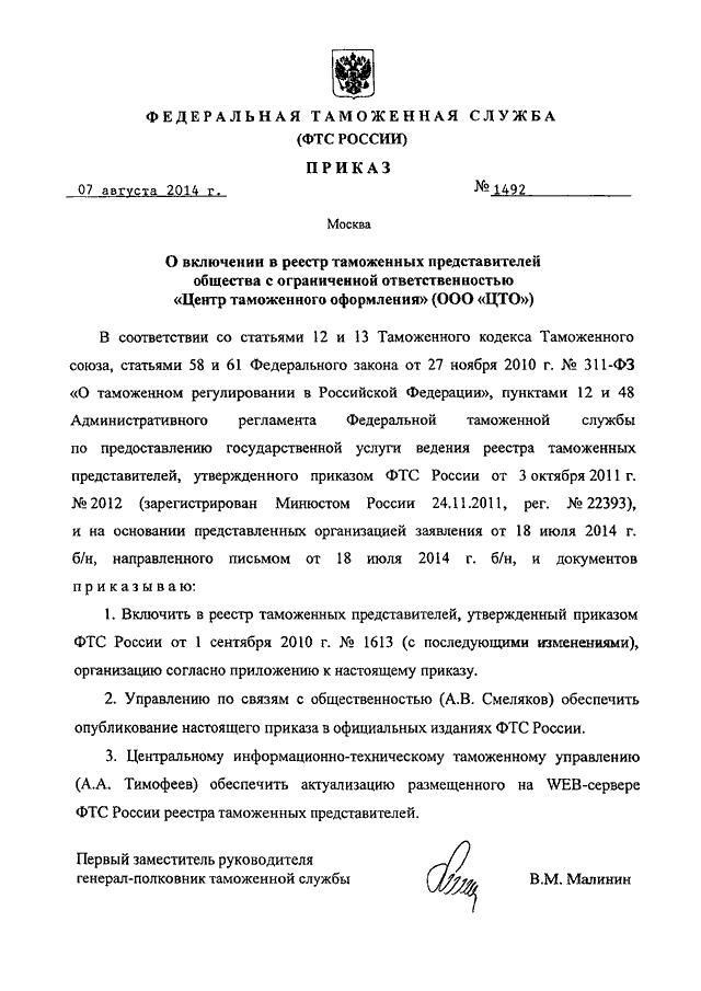 ПРИКАЗ ФТС РФ от 07.08.2014 N 1492