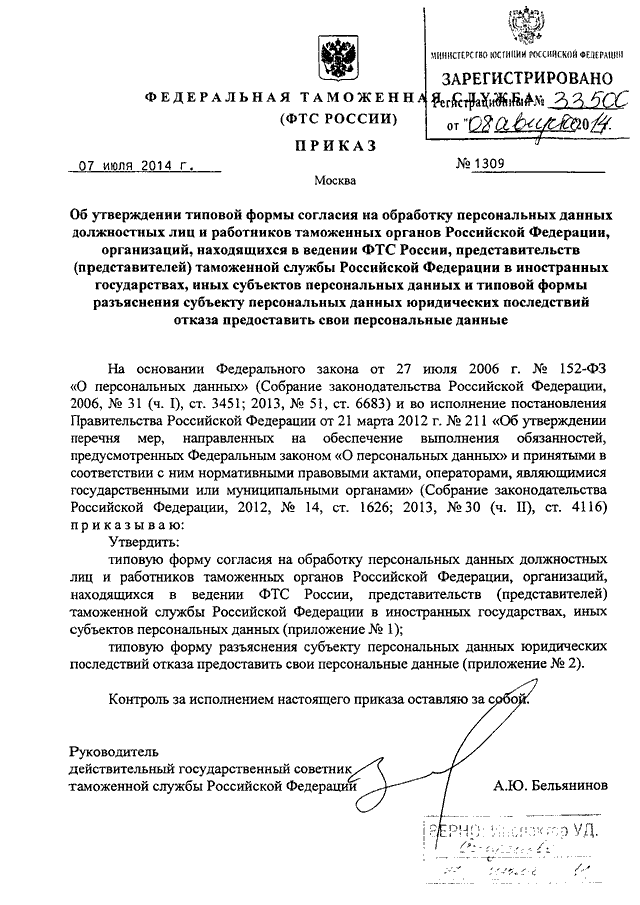 ПРИКАЗ ФТС РФ от 07.07.2014 N 1309