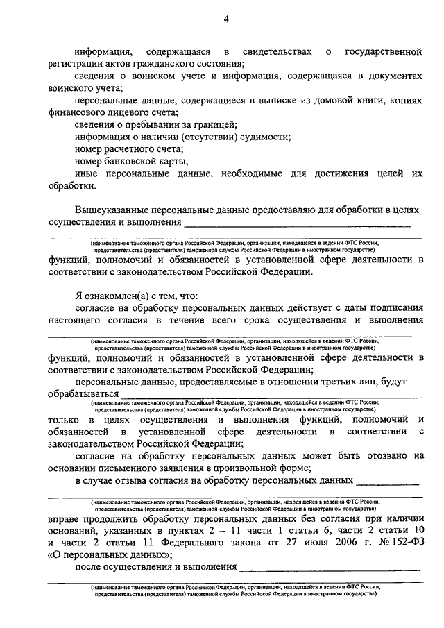 "ОБ УТВЕРЖДЕНИИ ТИПОВОЙ ФОРМЫ СОГЛАСИЯ НА ОБРАБОТКУ ПЕРСОНАЛЬНЫХ ДАННЫХ ДОЛЖНОСТНЫХ ЛИЦ И РАБОТНИКОВ ТАМОЖЕННЫХ ОРГАНОВ РОССИЙСКОЙ ФЕДЕРАЦИИ, ОРГАНИЗАЦИЙ, НАХОДЯЩИХСЯ В ВЕДЕНИИ ФТС РОССИИ, ПРЕДСТАВИТЕЛЬСТВ (ПРЕДСТАВИТЕЛЕЙ) ТАМОЖЕННОЙ СЛУЖБЫ РОССИЙСКОЙ ФЕДЕРАЦИИ В ИНОСТРАННЫХ ГОСУДАРСТВАХ, ИНЫХ СУБЪЕКТОВ ПЕРСОНАЛЬНЫХ ДАННЫХ И ТИПОВОЙ ФОРМЫ РАЗЪЯСНЕНИЯ СУБЪЕКТУ ПЕРСОНАЛЬНЫХ ДАННЫХ ЮРИДИЧЕСКИХ ПОСЛЕДСТВИЙ ОТКАЗА ПРЕДОСТАВИТЬ СВОИ ПЕРСОНАЛЬНЫЕ ДАННЫЕ"