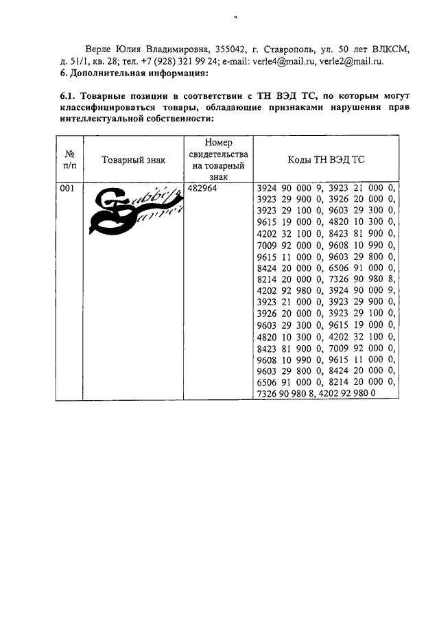 "О ТОВАРНОМ ЗНАКЕ ИНДИВИДУАЛЬНОГО ПРЕДПРИНИМАТЕЛЯ ВЕРЛЕ Ю.В."