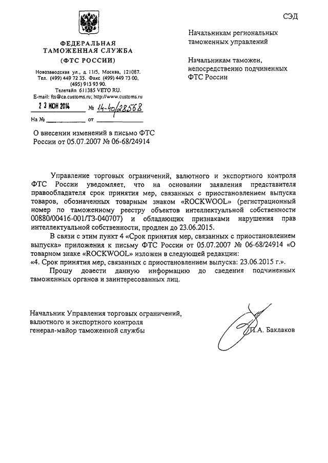 "О ВНЕСЕНИИ ИЗМЕНЕНИЙ В ПИСЬМО ФТС РОССИИ ОТ 05.07.2007 N 06-68/24914"