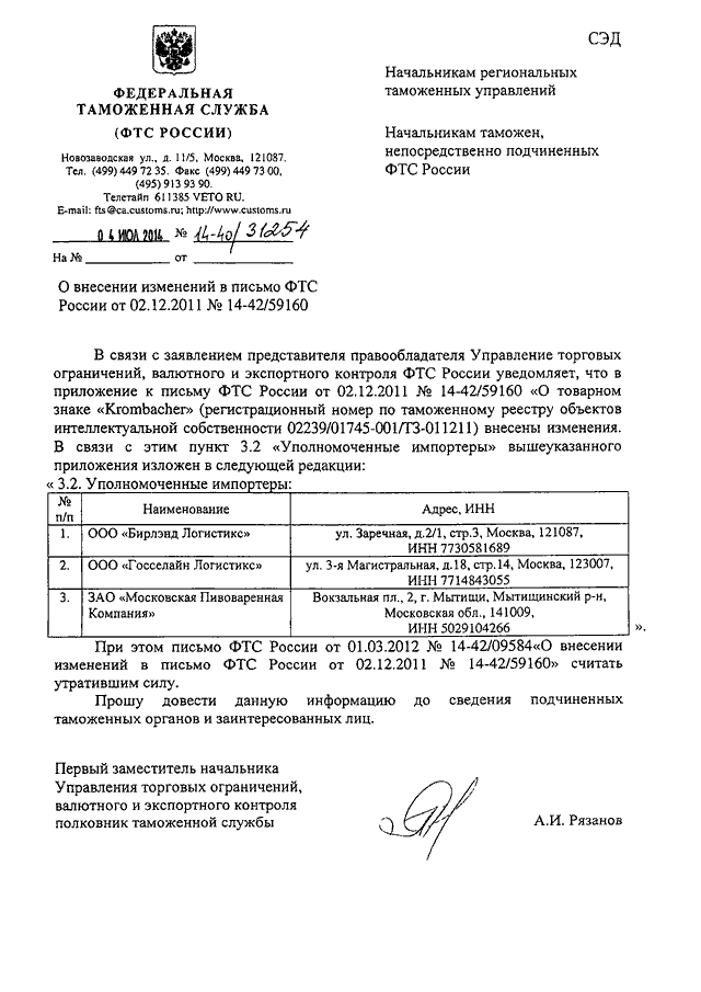 "О ВНЕСЕНИИ ИЗМЕНЕНИЙ В ПИСЬМО ФТС РОССИИ ОТ 02.12.2011 N 14-42/59160"