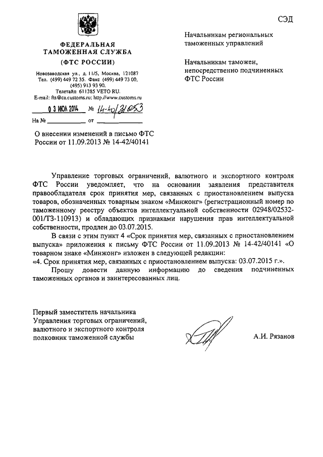 ПИСЬМО ФТС РФ от 03.07.2014 N 14-40/31053 "О ВНЕСЕНИИ ИЗМЕНЕНИЙ В ПИСЬМО ФТС РОССИИ ОТ 11.09.2013 N 14-42/40141
