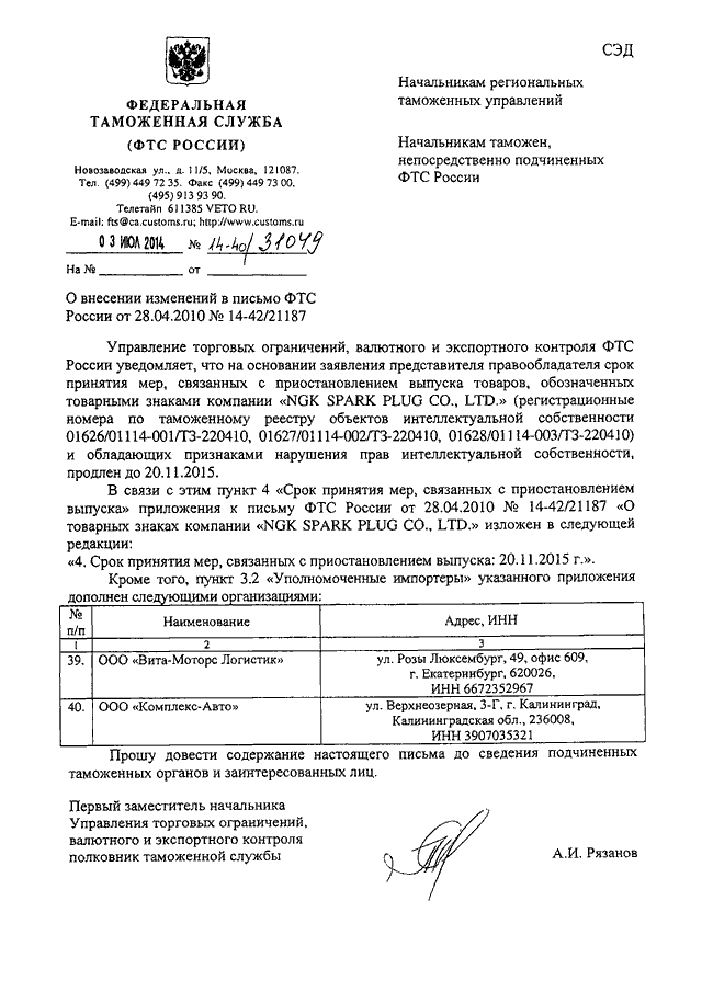 ПИСЬМО ФТС РФ от 03.07.2014 N 14-40/31049