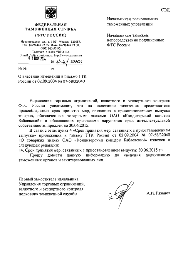 ПИСЬМО ФТС РФ от 01.07.2014 N 14-40/30502