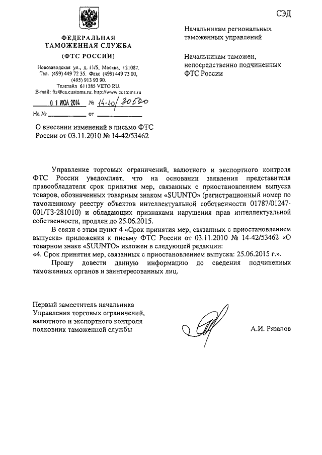 ПИСЬМО ФТС РФ от 01.07.2014 N 14-40/30500