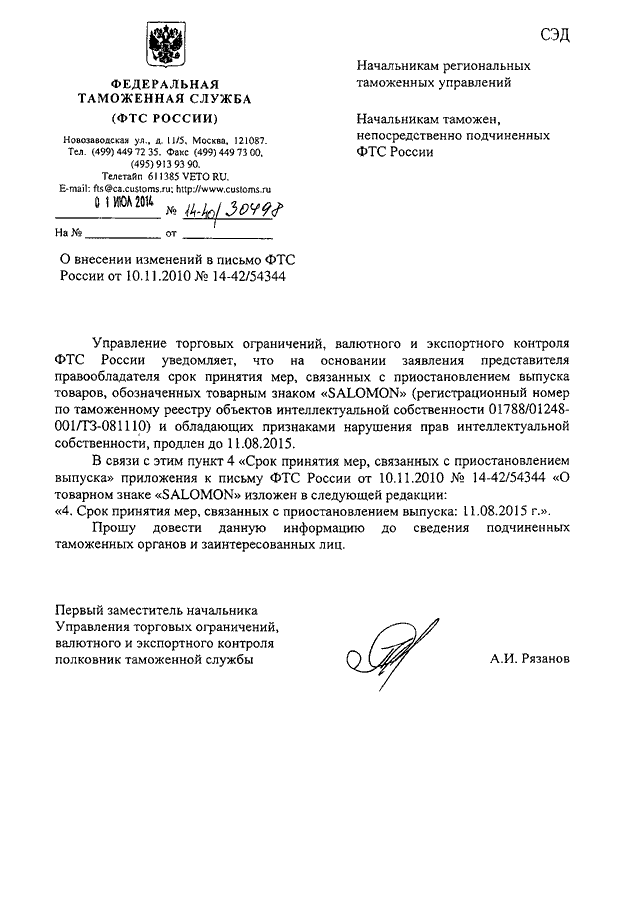 "О ВНЕСЕНИИ ИЗМЕНЕНИЙ В ПИСЬМО ФТС РОССИИ ОТ 10.11.2010 N 14-42/54344"