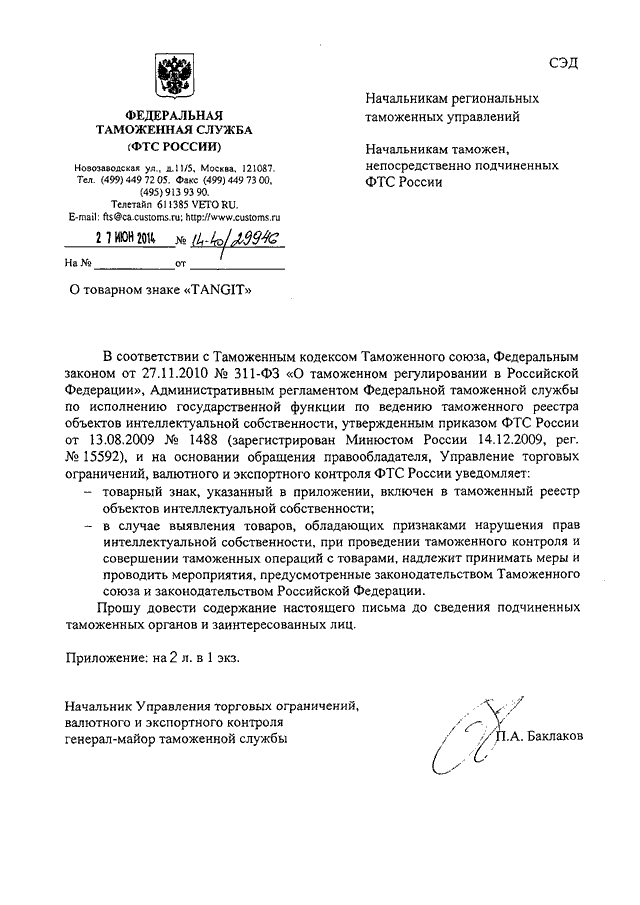 ПИСЬМО ФТС РФ от 27.06.2014 N 14-40/29946