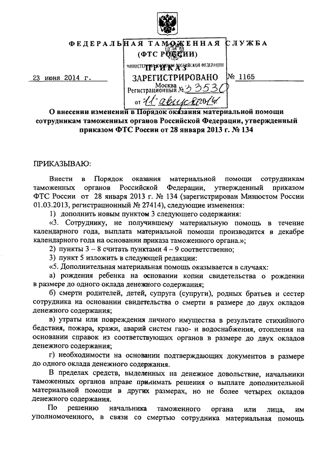 ПРИКАЗ ФТС РФ от 23.06.2014 N 1165 "О ВНЕСЕНИИ ИЗМЕНЕНИЙ В ПОРЯДОК ОКАЗАНИЯ МАТЕРИАЛЬНОЙ ПОМОЩИ