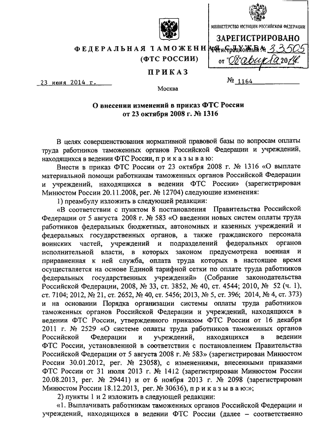 ПРИКАЗ ФТС РФ от 23.06.2014 N 1164