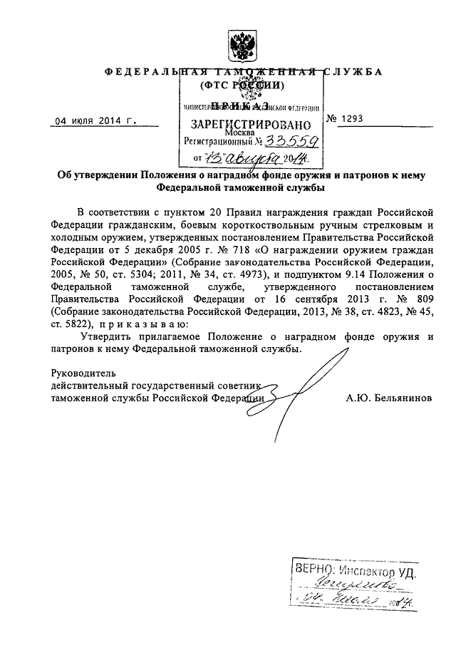 ПРИКАЗ ФТС РФ от 04.07.2014 N 1293