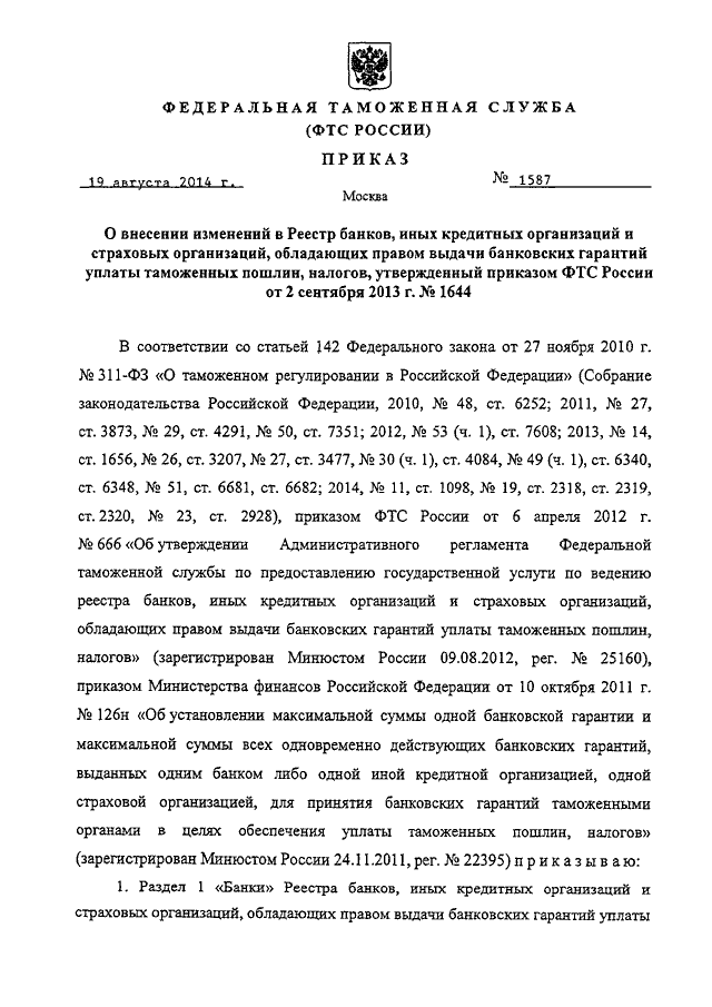 ПРИКАЗ ФТС РФ от 19.08.2014 N 1587 "О ВНЕСЕНИИ ИЗМЕНЕНИЙ В РЕЕСТР БАНКОВ, ИНЫХ КРЕДИТНЫХ ОРГАНИЗАЦИЙ