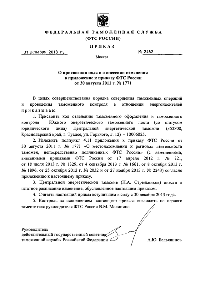 ПРИКАЗ ФТС РФ от 31.12.2013 N 2482