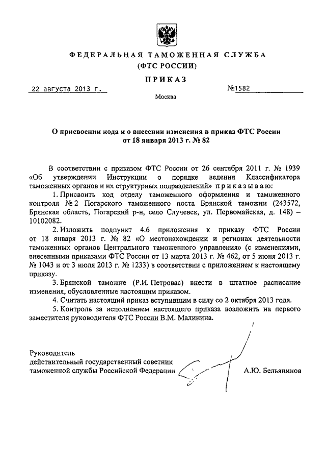 ПРИКАЗ ФТС РФ от 22.08.2013 N 1582