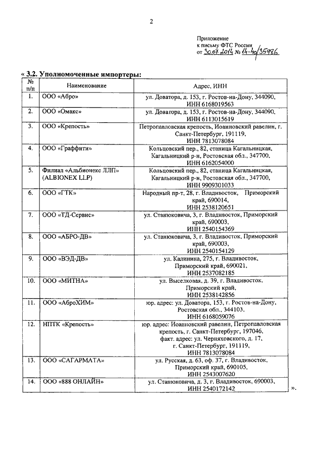 ПИСЬМО ФТС РФ от 30.07.2014 N 14-40/35986