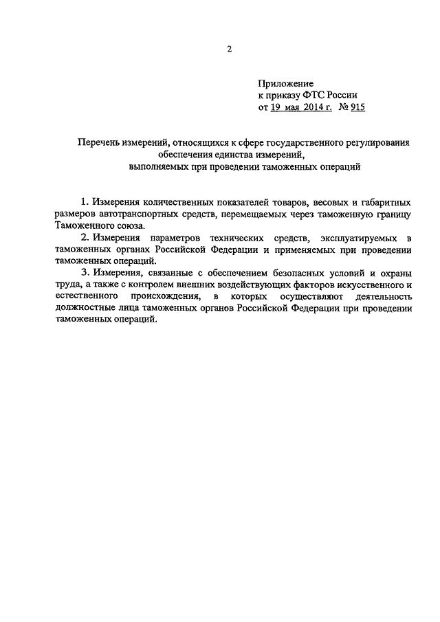 ПРИКАЗ ФТС РФ от 19.05.2014 N 915 "ОБ УТВЕРЖДЕНИИ ПЕРЕЧНЯ ИЗМЕРЕНИЙ, ОТНОСЯЩИХСЯ К СФЕРЕ