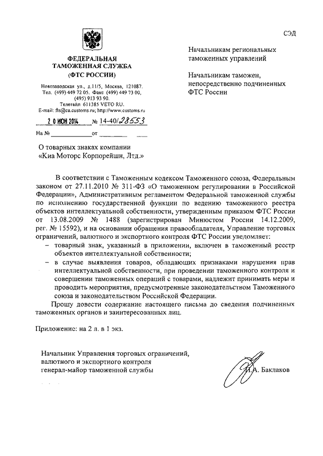 ПИСЬМО ФТС РФ от 20.06.2014 N 14-40/28553