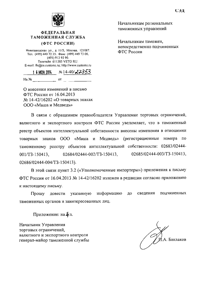 "О ВНЕСЕНИИ ИЗМЕНЕНИЙ В ПИСЬМО ФТС РОССИИ ОТ 16.04.2013 N 14-42/16202 "О ТОВАРНЫХ ЗНАКАХ ООО "МАША И МЕДВЕДЬ"