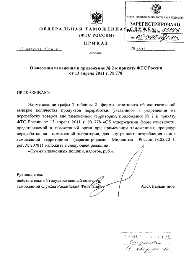 ПРИКАЗ ФТС РФ от 13.08.2014 N 1532