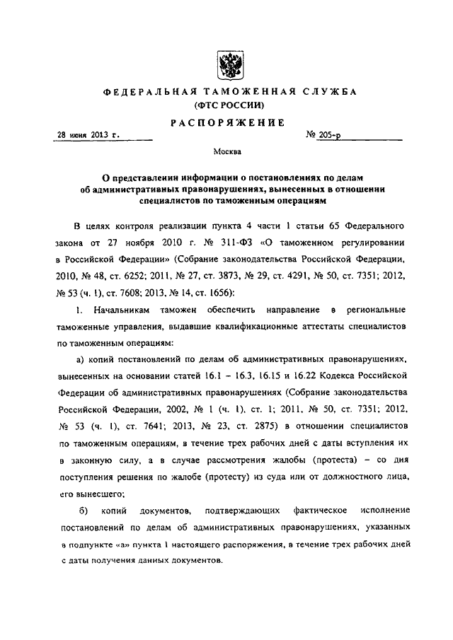 РАСПОРЯЖЕНИЕ ФТС РФ от 28.06.2013 N 205-р