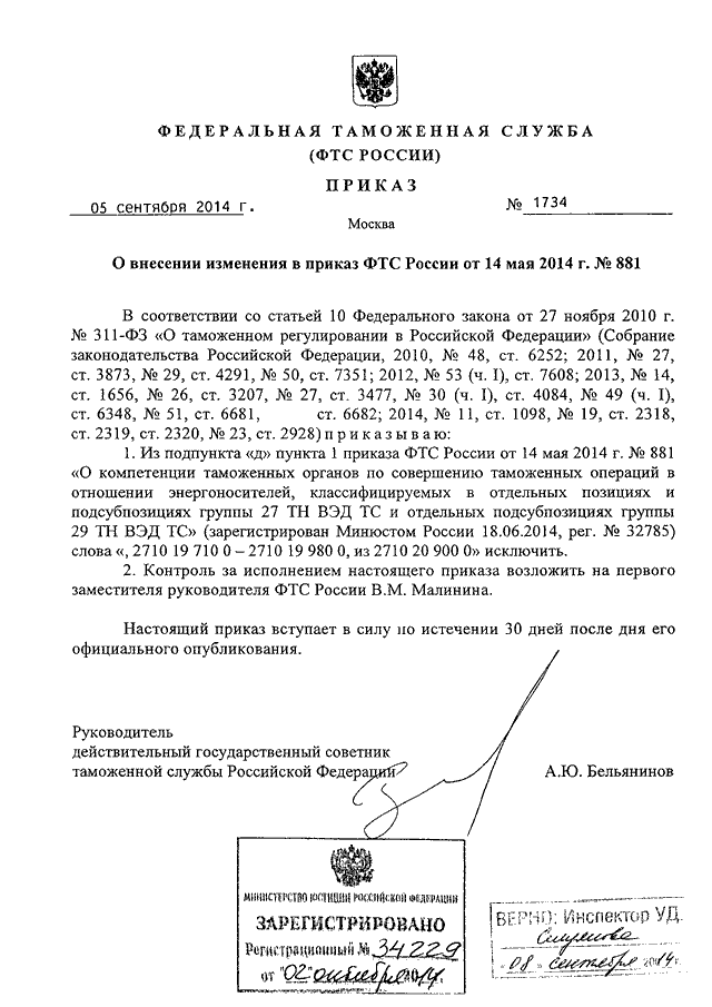 ПРИКАЗ ФТС РФ от 05.09.2014 N 1734