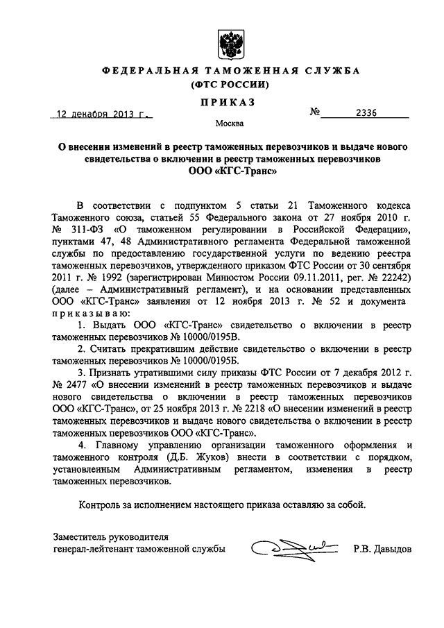 ПРИКАЗ ФТС РФ от 12.12.2013 N 2336