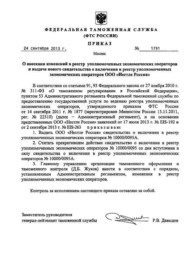 "О ВНЕСЕНИИ ИЗМЕНЕНИЙ В РЕЕСТР УПОЛНОМОЧЕННЫХ ЭКОНОМИЧЕСКИХ ОПЕРАТОРОВ И ВЫДАЧЕ НОВОГО СВИДЕТЕЛЬСТВА О ВКЛЮЧЕНИИ В РЕЕСТР УПОЛНОМОЧЕННЫХ ЭКОНОМИЧЕСКИХ ОПЕРАТОРОВ ООО "НЕСТЛЕ РОССИЯ"