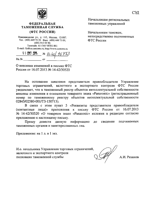 "О ВНЕСЕНИИ ИЗМЕНЕНИЙ В ПИСЬМО ФТС РОССИИ ОТ 16.07.2013 N 14-42/30520"
