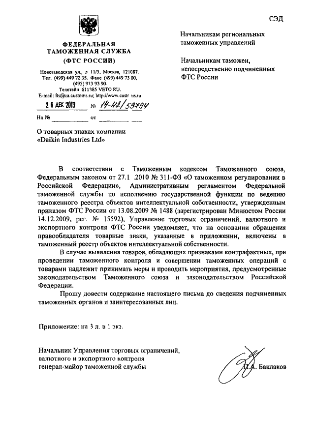 ПИСЬМО ФТС РФ от 26.12.2013 N 14-42/59794