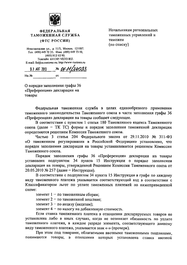 ПИСЬМО ФТС РФ от 07.08.2013 N 01-11/34033