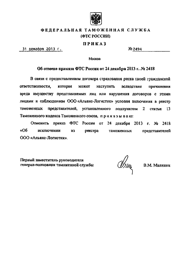 ПРИКАЗ ФТС РФ от 31.12.2013 N 2494