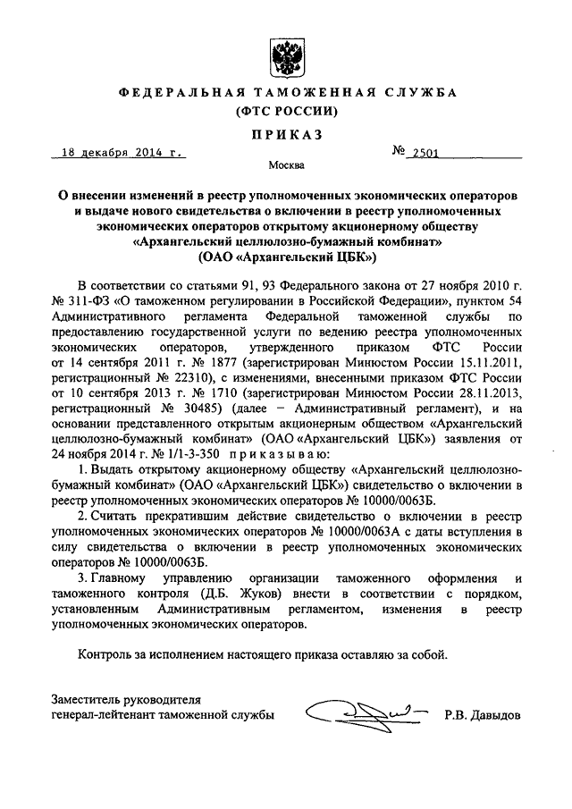 ПРИКАЗ ФТС РФ от 18.12.2014 N 2501 "О ВНЕСЕНИИ ИЗМЕНЕНИЙ В РЕЕСТР УПОЛНОМОЧЕННЫХ ЭКОНОМИЧЕСКИХ