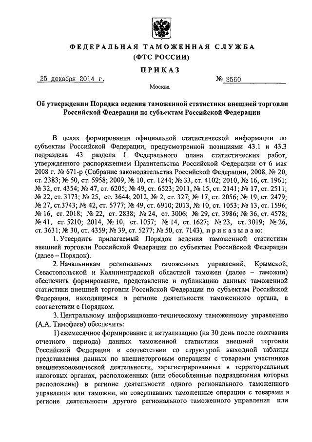 ПРИКАЗ ФТС РФ от 25.12.2014 N 2560