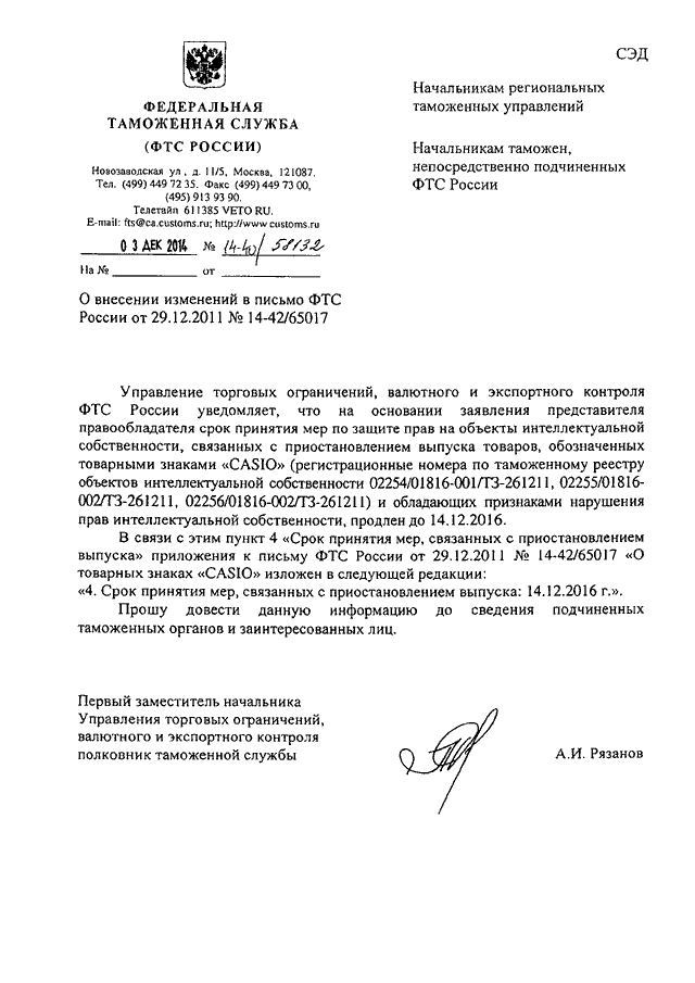 "О ВНЕСЕНИИ ИЗМЕНЕНИЙ В ПИСЬМО ФТС РОССИИ ОТ 29.12.2011 N 14-42/65017"